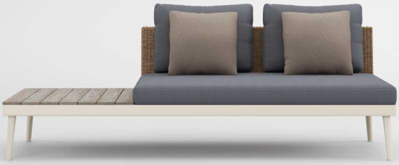 Its distinct matte Resinweave is handwoven and offered exclusively to the 20TWENTY collection in two colors: Blonde and Blu. The Right Arm Loveseat with Driftwood End Table can easily be joined together with sectional units with a clip-on connector for ease in planning.