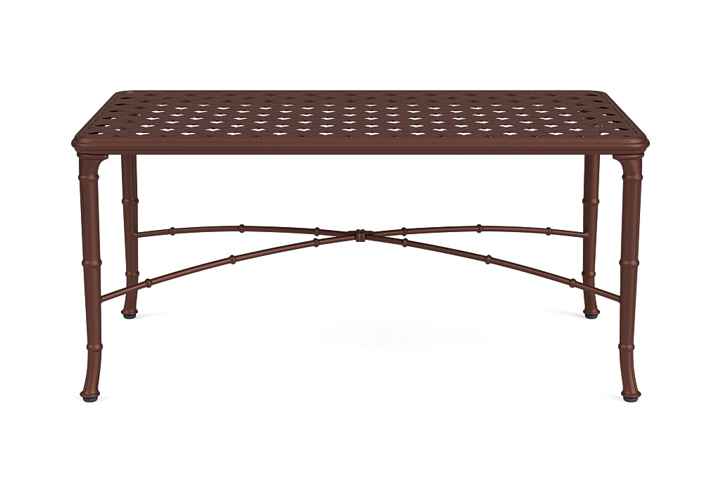Inspired by the design themes of Chippendale furniture, the Coffee Table features tapered legs and a lower x-stretcher continuing the exotic bamboo construct. Elegant and detailed aluminum weave top is hand-finished to deliver a jewel-like product. Heirloom quality and design innovation encompass each piece from the Calcutta collection.Read More
